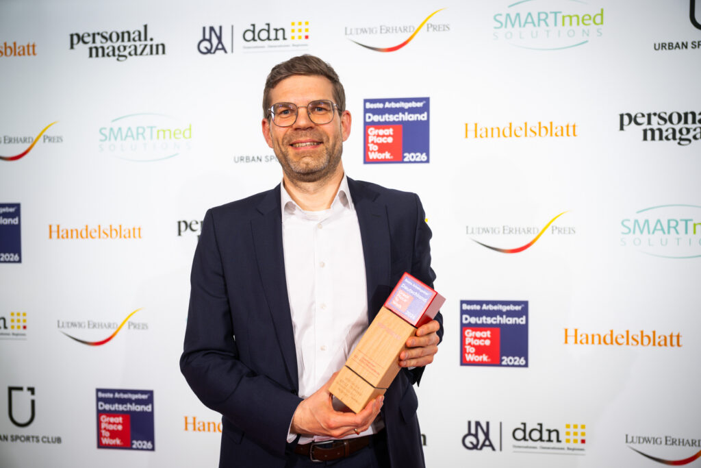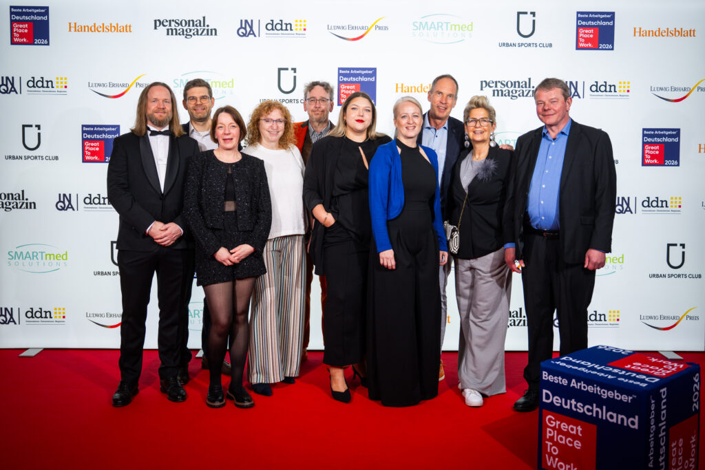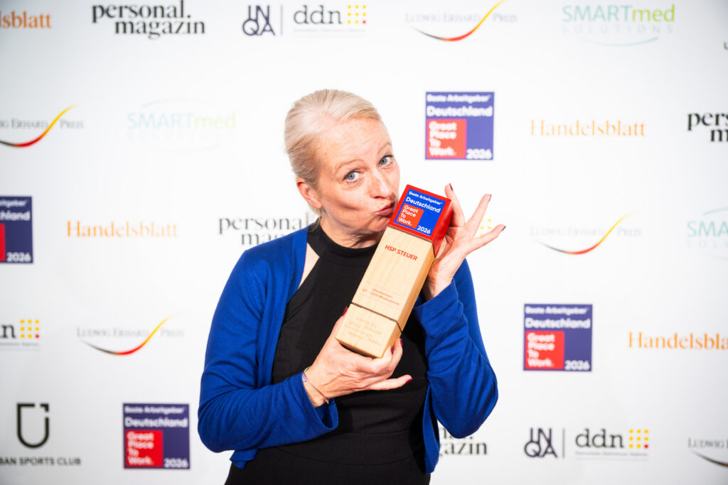 Bei der feier­li­chen Prämie­rungs­gala „Deutsch­lands Beste Arbeit­geber 2026“ des Forschungs- und Bera­tungs­in­sti­tuts Great Place to Work® durfte unser Team gleich vier der begehr­testen Arbeit­geber-Siegel des Landes entge­gen­nehmen. In der bran­chen­über­grei­fenden Gesamt­wer­tung „Deutsch­lands Beste Arbeit­geber 2026“ in der Kate­gorie 501 bis 2.000 Mitar­bei­tende haben wir einen starken 13. Platz belegt. Das ist an sich eine hervor­ra­gende Plat­zie­rung, für die Branche Steuer­beratung stehen wir aller­dings als einsame Spitze da. Ergänzt wird dieser tolle Erfolg durch drei weitere, heraus­ra­gende Prämie­rungen: