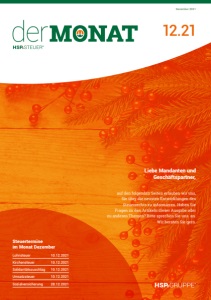 12.21 Dezember 2021 Liebe Mandanten und Geschäftspartner, auf den folgenden Seiten erlauben wir uns, Sie über die neusten Entwicklungen des Steuerrechts zu informieren. Haben Sie Fragen zu den Artikeln dieser Ausgabe oder zu anderen Themen? Bitte sprechen Sie uns an. Wir beraten Sie gern. Lohnsteuer 10.12.2021 Kirchensteuer 10.12.2021 Solidaritätszuschlag 10.12.2021 Umsatzsteuer 10.12.2021 Steuertermine im Monat Dezember Sozialversicherung 28.12.2021